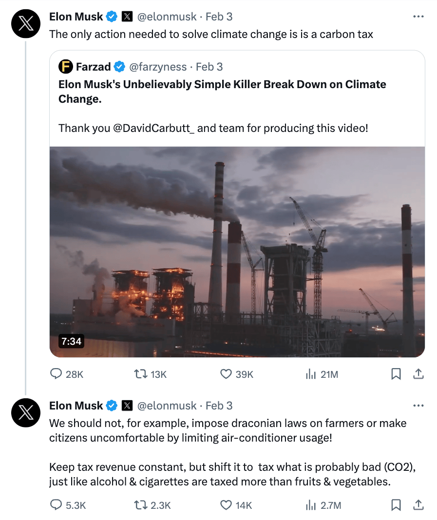 Elon’s been a long time supporter of a carbon tax - it sounds good in theory, but speaking as a Canadian, the carbon tax has been the single most controversial political decision made here in the past decade… It does not go down easy