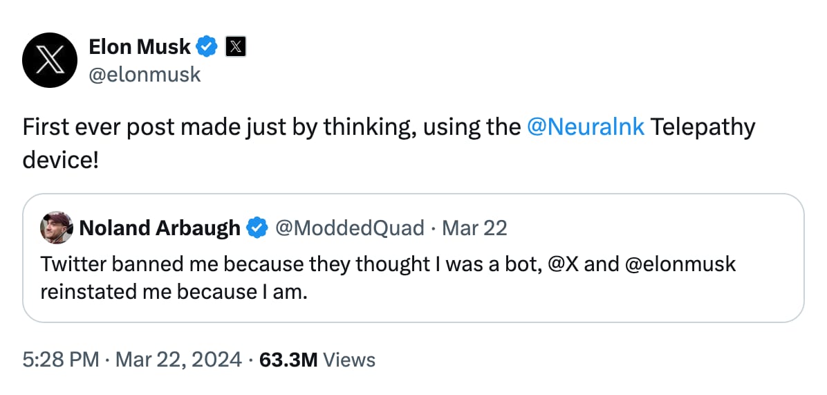 The first Neuralink patient is alive and well and posting on X with Telepathy!