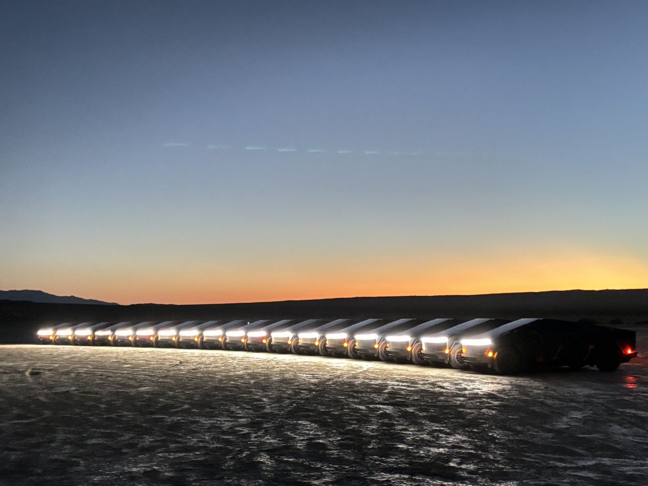 Sunrise with Cybertrucks. By Aaron Cash. Here are the same 18 trucks rolling through SoCal on video