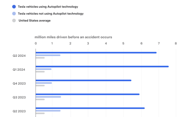 Tesla releases the latest Vehicle Safety Report. Miles per Driven per one accident for Q2 2024: