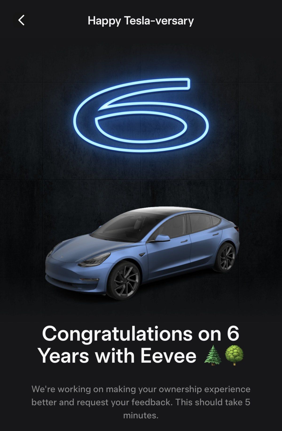 The Tesla App now celebrates your vehicle’s anniversary. Yep, I know.