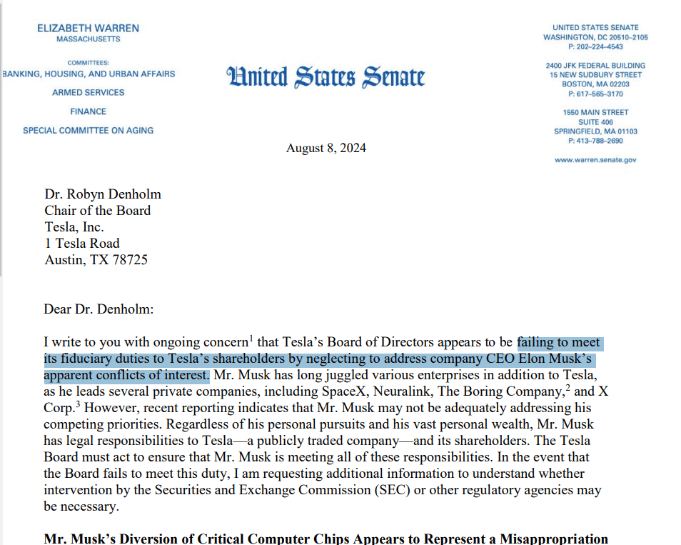Tesla shareholders have put together a letter to Senator Karen Elisabeth Warren, in response to her “concerning” letter to the Tesla Chair of the Board, Dr. Robyn Denholm about Tesla Board not meeting its fiduciary duties over addressing Elon’s conflicts of interest. Shareholders led by Alexandra Merz once again.