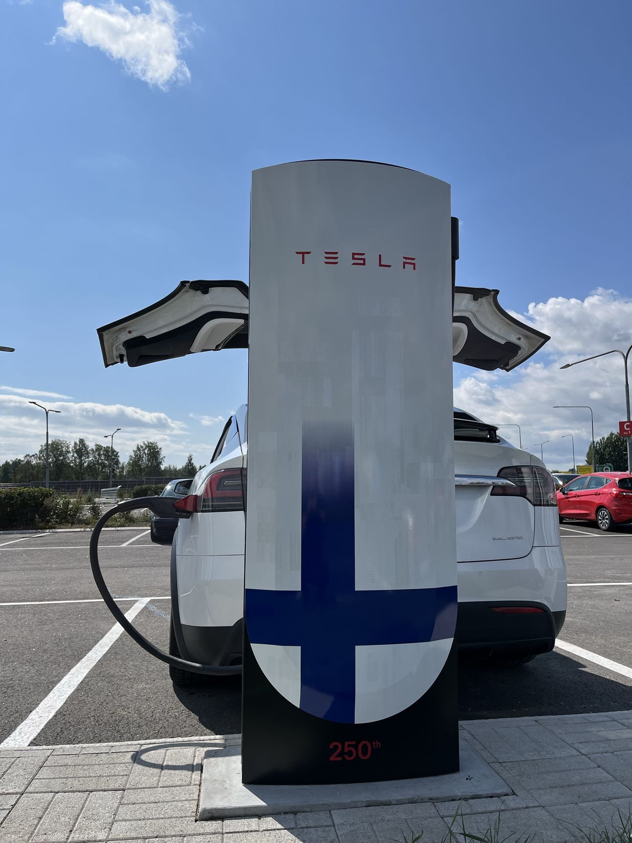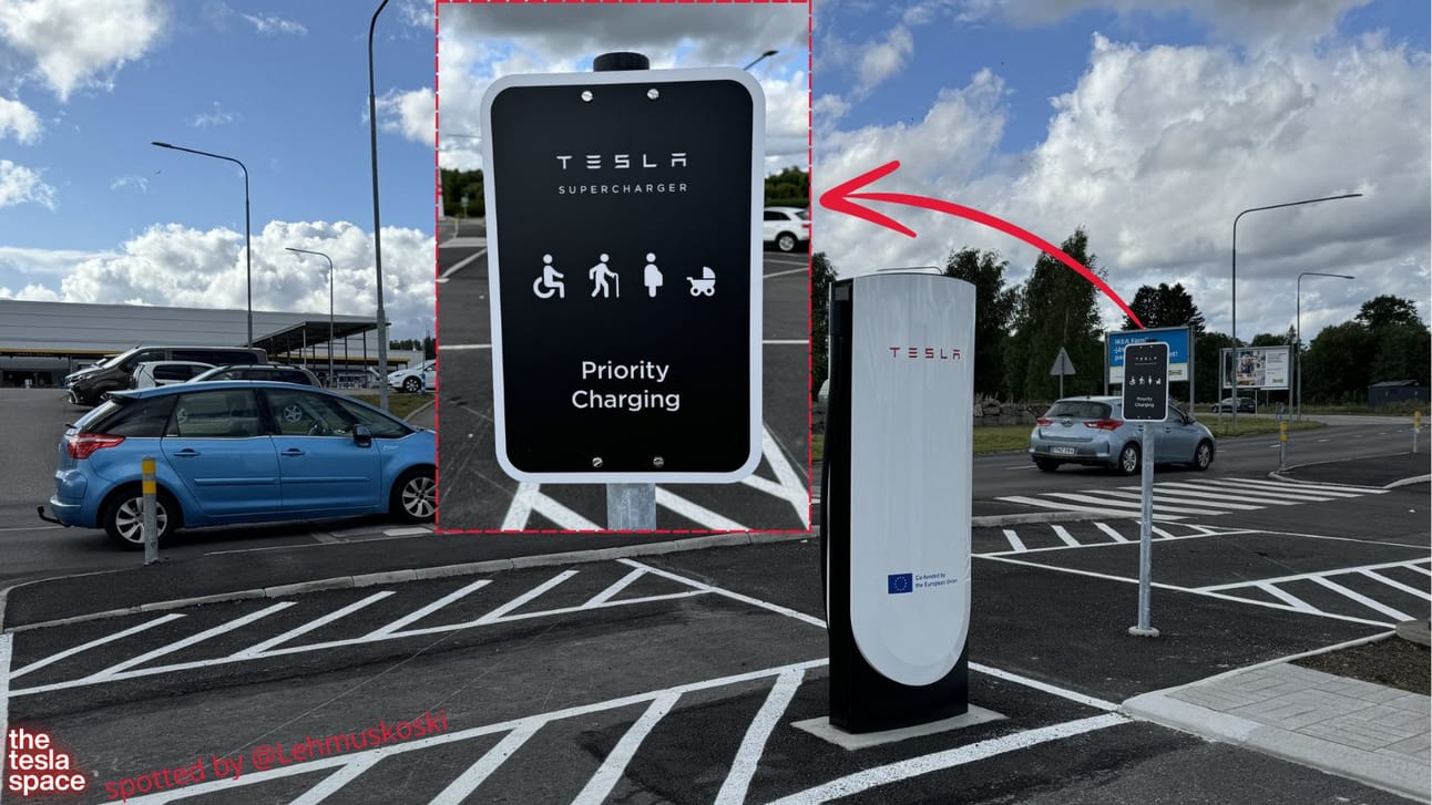 A priority Tesla Supercharging stall in Finland. Is this the first in the world? It has ample space for wheelchair access, families, and the elderly.