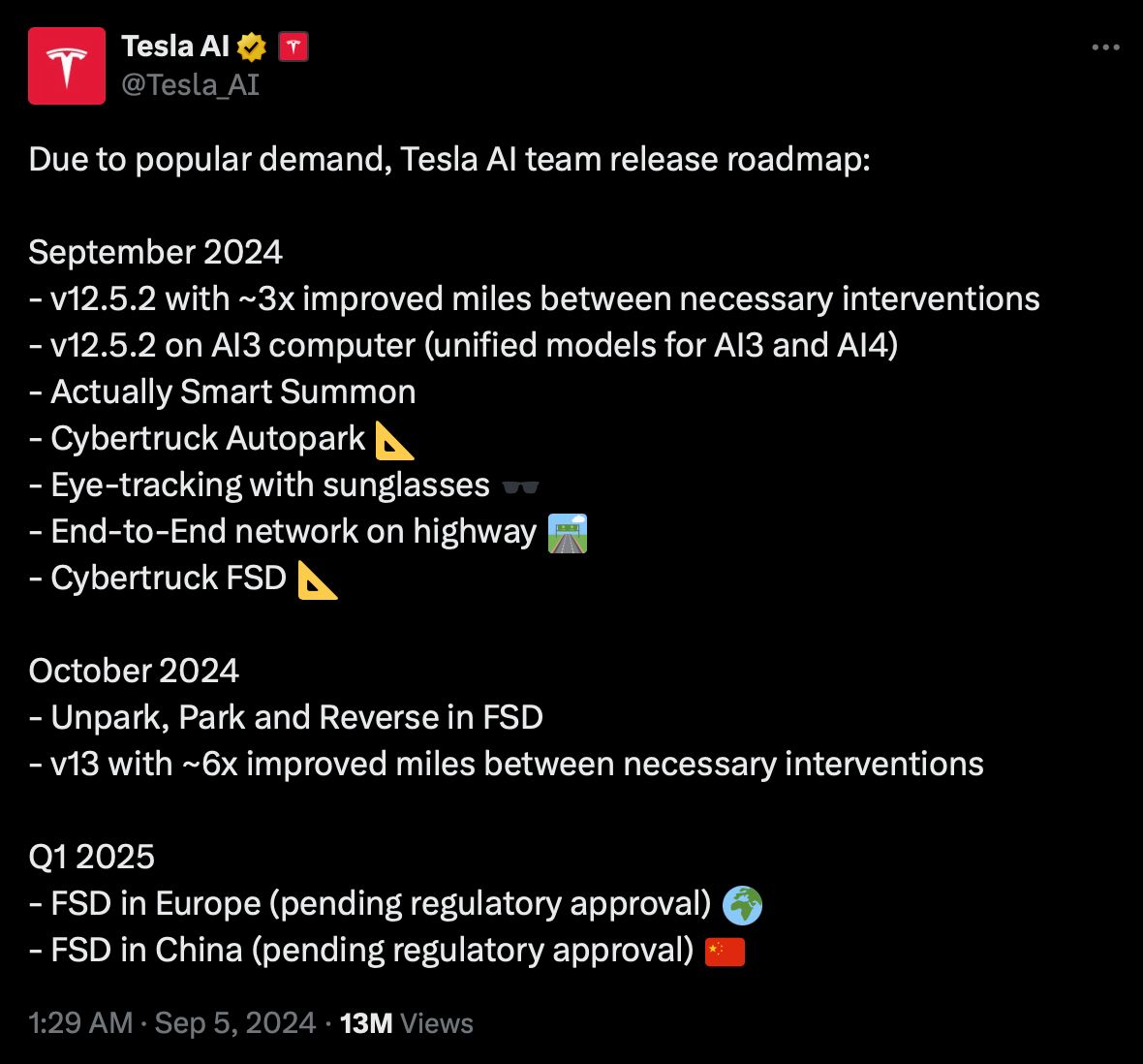 With Tesla launching Cybertruck FSD in the last hour of the month they completed their whole list of September 2024’s roadmap we saw on earlier this month.