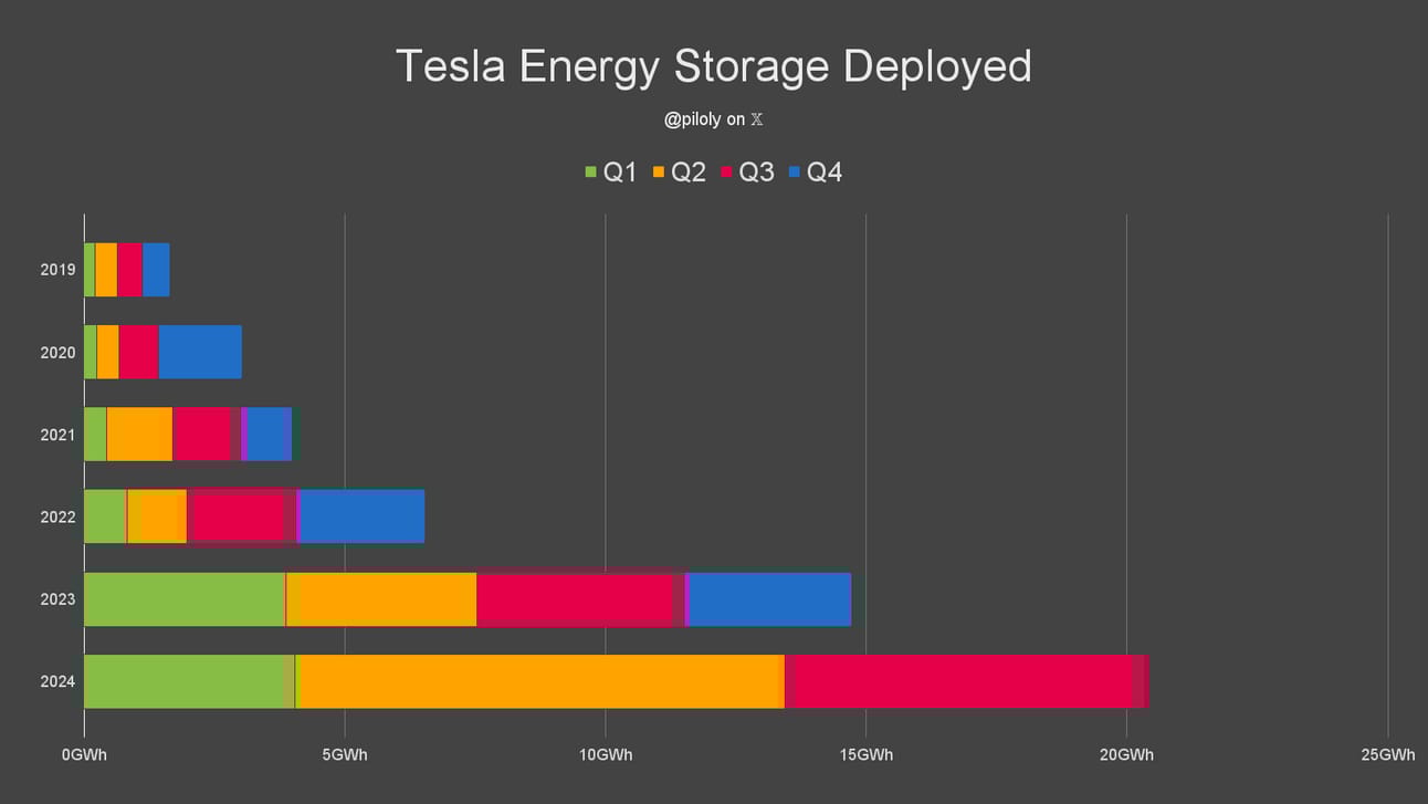 Tesla Energy deployed 6.9 GWh in Q3, and with reaching 20.3 GWh in these three quarters has now exceeded the whole of 2023 already (14.7 GWh). Perhaps an even better scale, this Q3 deployment was larger than the full year of 2022 (6.5 GWh).