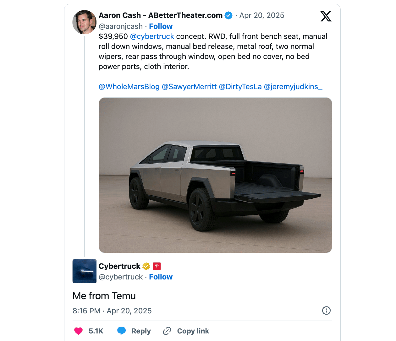 My question is — how much does BYD pay for something like this? It’d have to be a lot for a channel like carwow to compromise themselves in such an obvious manner. Or perhaps its political?Good to see Cybertruck account is able to joke about a poke at the stripped down Cybertruck we covered last week: