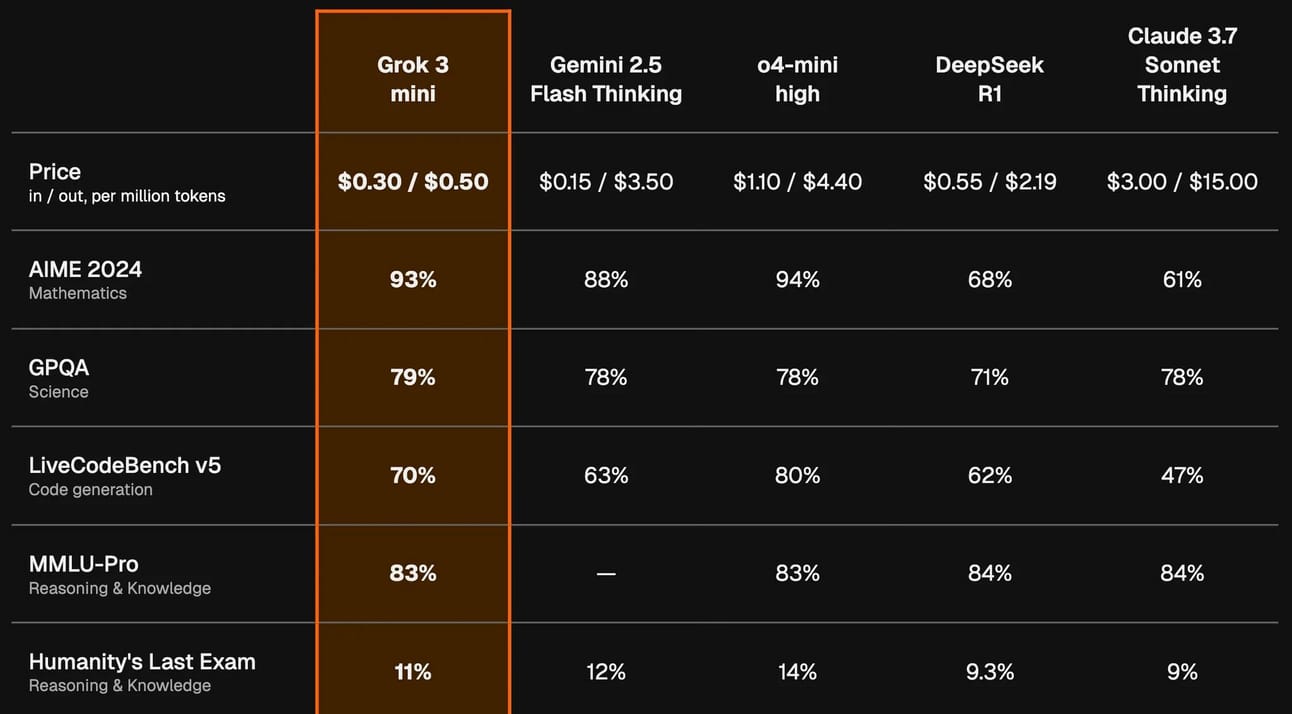 Meanwhile, Grok 3 Mini tops the leaderboards on graduate-level STEM, math, and coding. It outcompetes flagship models that are 20x more expensive. It is 5x cheaper than any other reasoning model on the market, setting the standards for cost-effective intelligence.