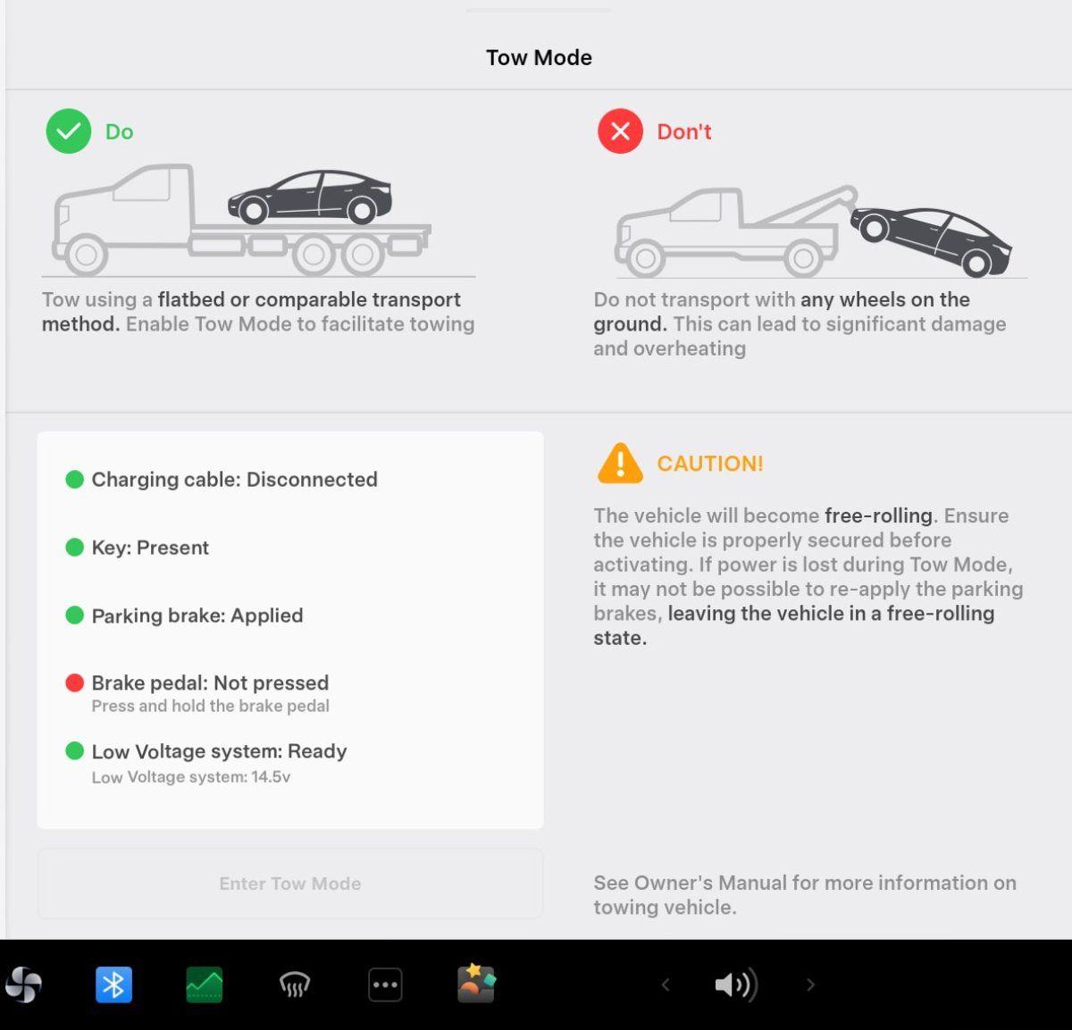 Tesla improves Tow Mode — now displays a checklist similar to Car Wash Mode. Each item in the list will light up green or red, depending on whether it’s already in the correct setting for Tow Mode. Tesla has also added a readout of the low-voltage battery.