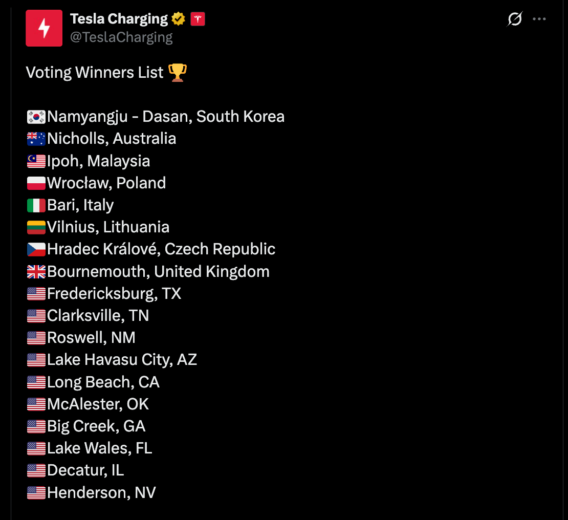 New Tesla Supercharging vote winners are announced, and the next quarterly vote is live — go vote to get a Supercharger in a location you want.