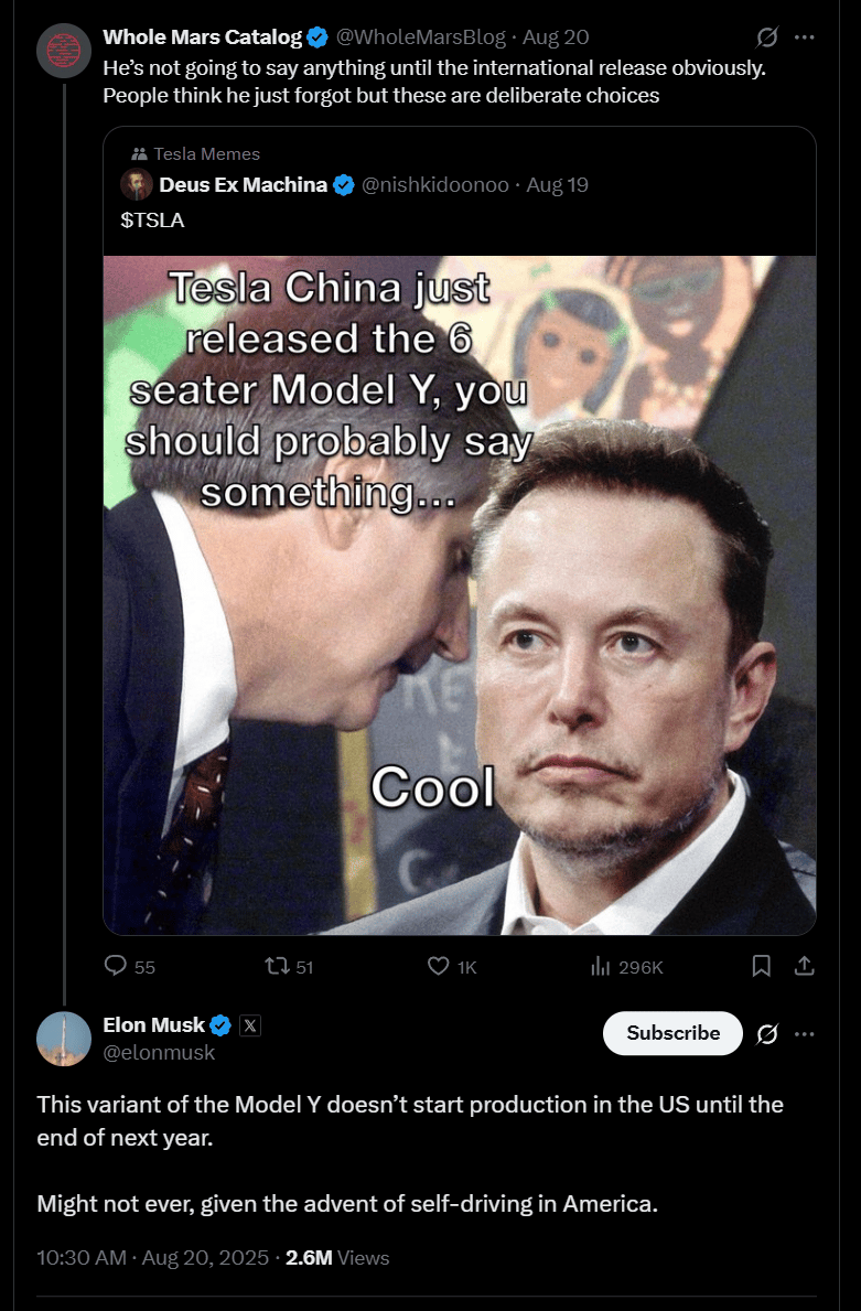 The only logical answer to why the Model Y L wouldn’t be produced in the US the same way it launched in China hides in the first words of Elon’s post.