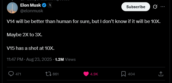 And he also says "FSD Version 14 is the second biggest update to Tesla AI/Autopilot ever after V12. It feels alive.”