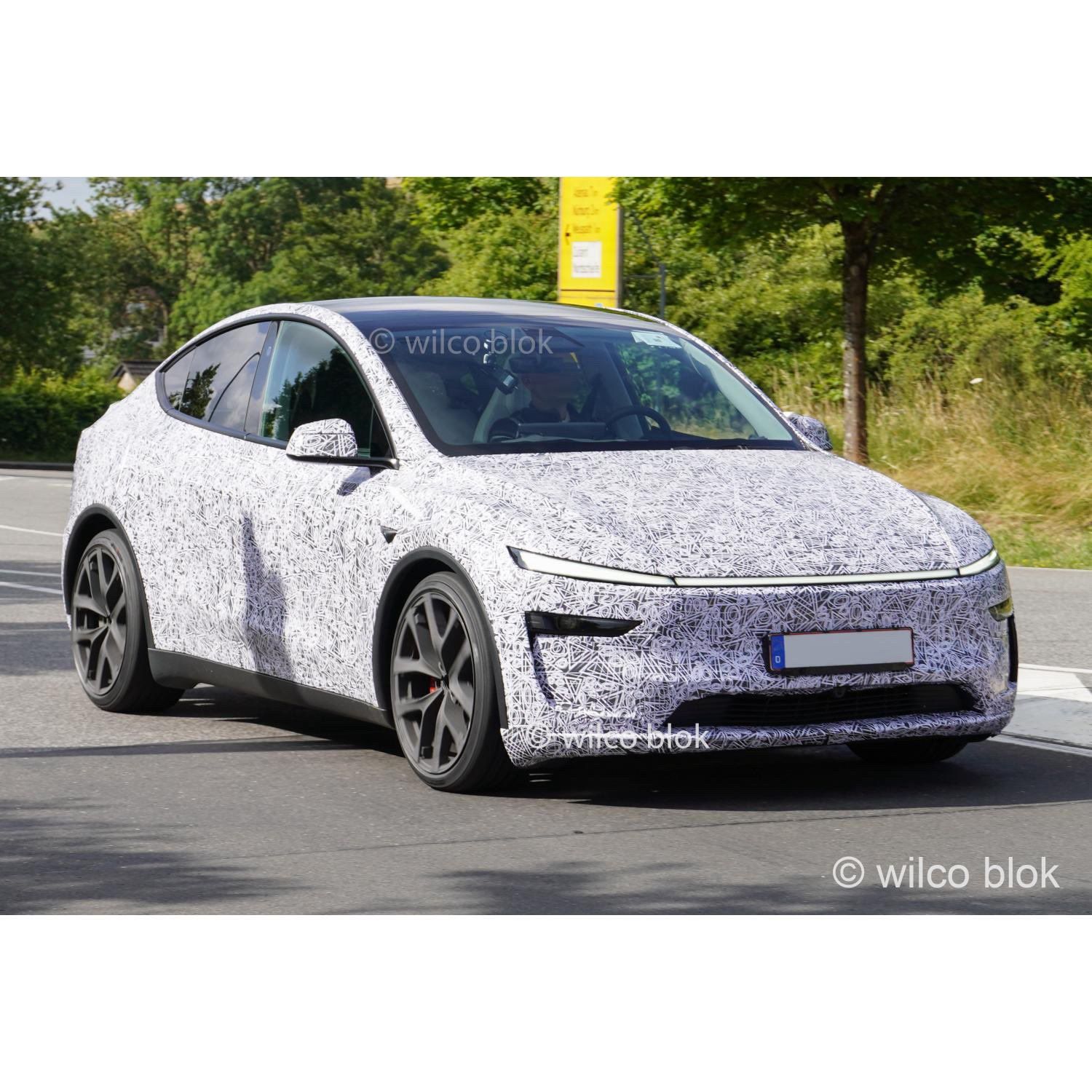 Tesla Model Y Performance was spotted around Nurburgring with new features - 21’’ rims, new rear carbon fiber spoiler, looks like new diffuser, updated brakes, all black headliner, bucket seats similar to Model Y L in China.