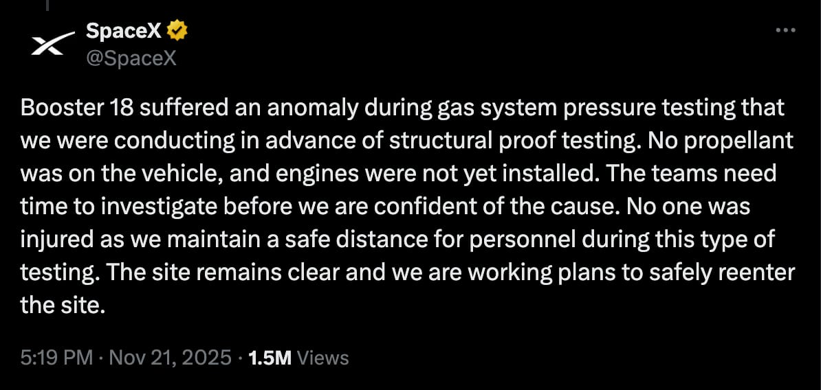 SpaceX also said they’re sticking with the schedule despite this: "The Starbase team plans to have the next Super Heavy booster stacked in December, which puts it on pace with the test schedule planned for the first Starship V3 vehicle and associated ground systems. Starship’s twelfth flight test remains targeted for the first quarter of 2026."