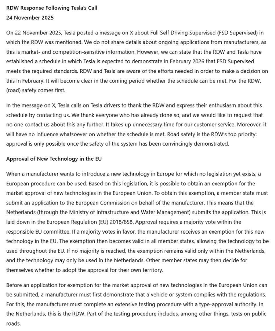 Tesla stated that “Currently, RDW has committed to granting Netherlands National approval in February 2026.”