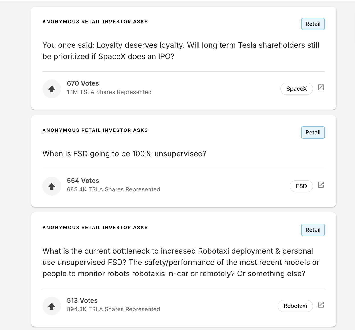 Tesla’s Q4 and Full Year earnings call is next week (January 29, 2026, 12:30 AM EET), and the retail & institutional questions are up on Say for the Q&A part. These are the highest-voted questions so far:
