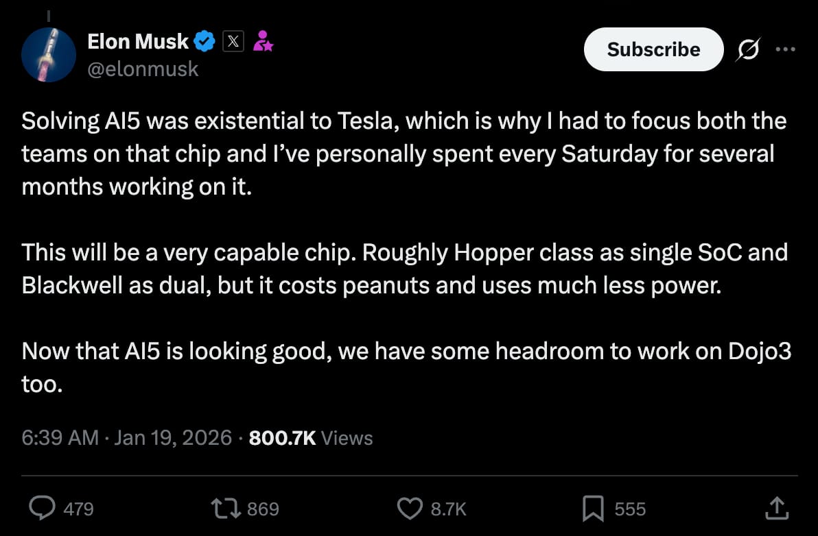 And then, while we’re at it, Elon also noted that AI5 was existential to Tesla, which he hasn’t said very often, so it carries some weight: