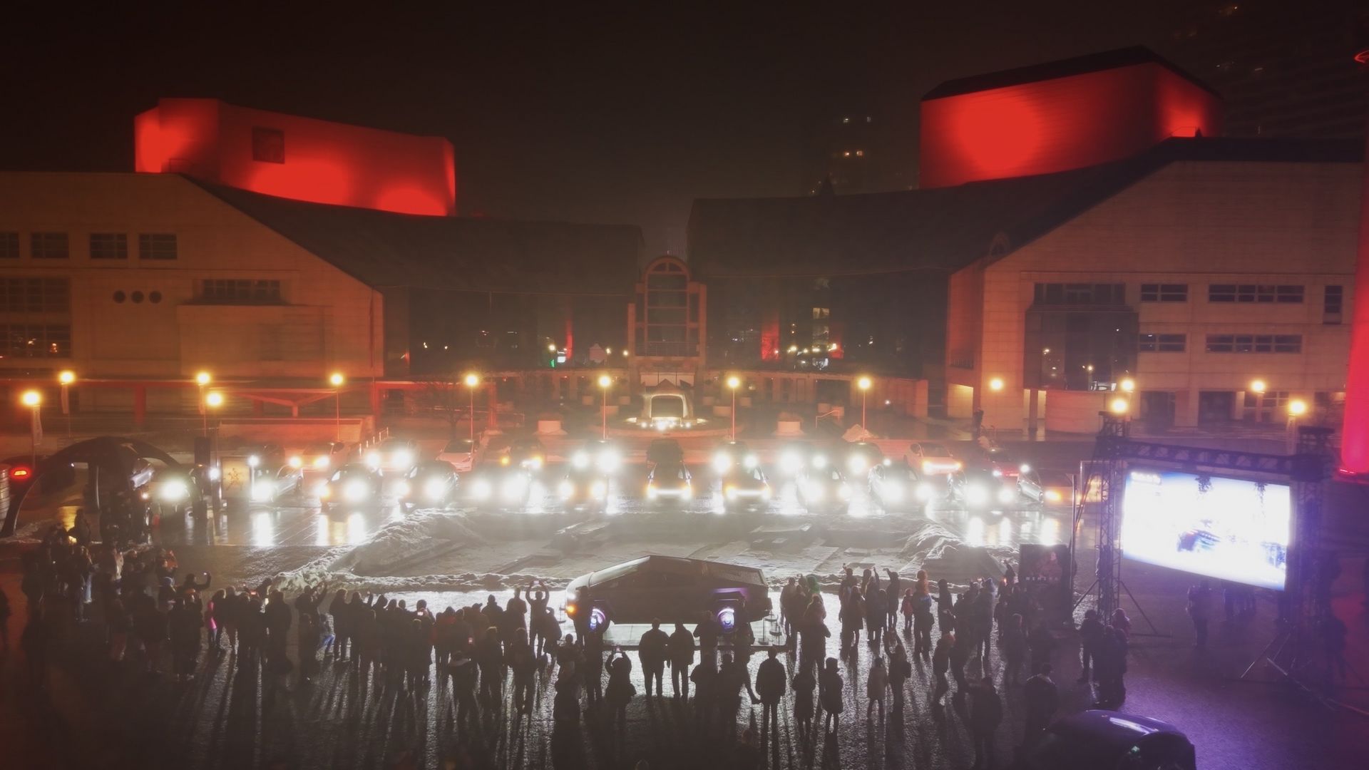 The Tesla Owners Slovakia club gave a warm welcome to Tesla in the form of a light show in front of the Slovak National Theater:
