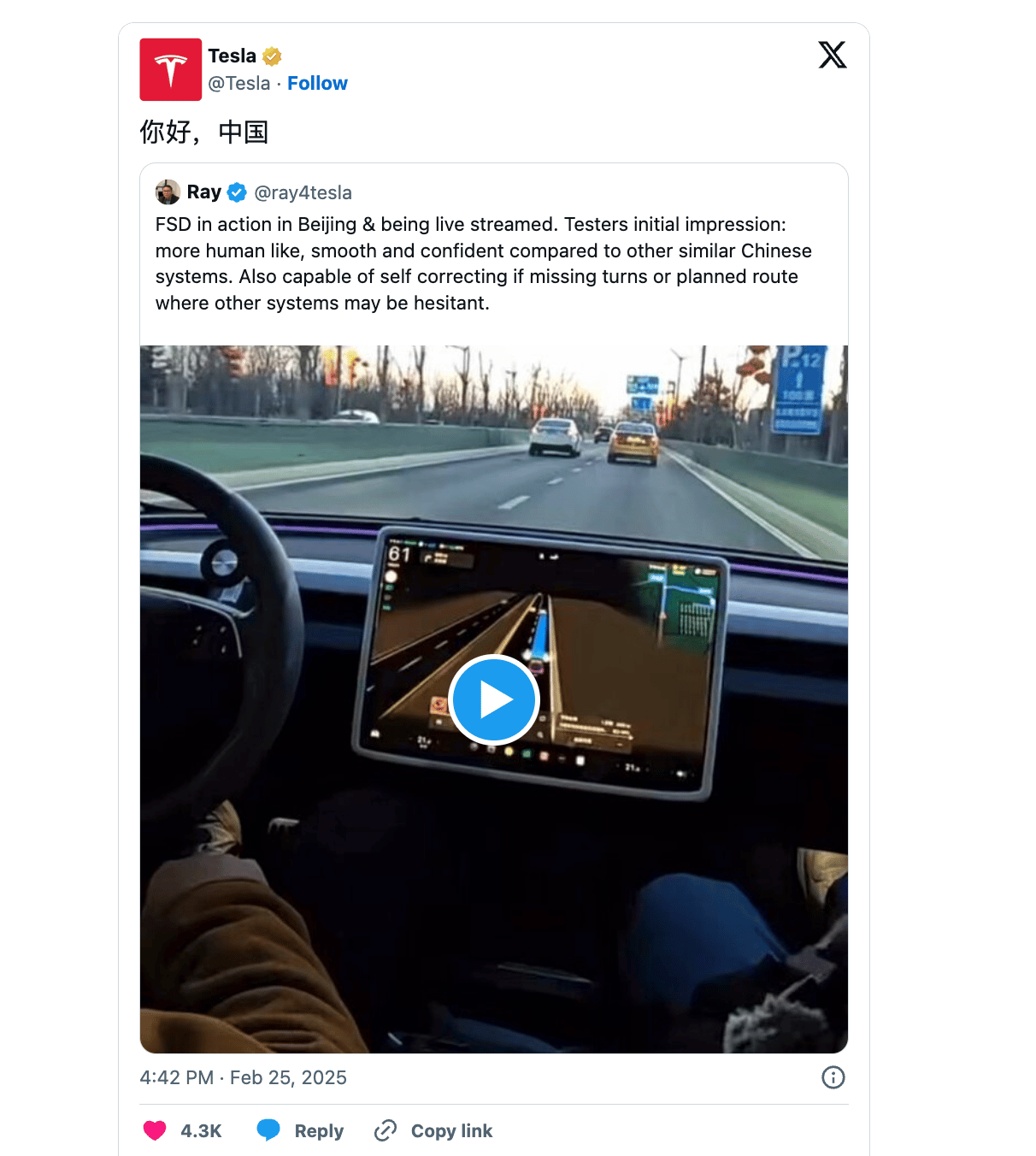 I would assume we’ll soon get some “oh FSD can’t handle this or that in China” news soon, which won’t be taking into account of how Tesla is basically building on top of a significantly downgraded version - for now.