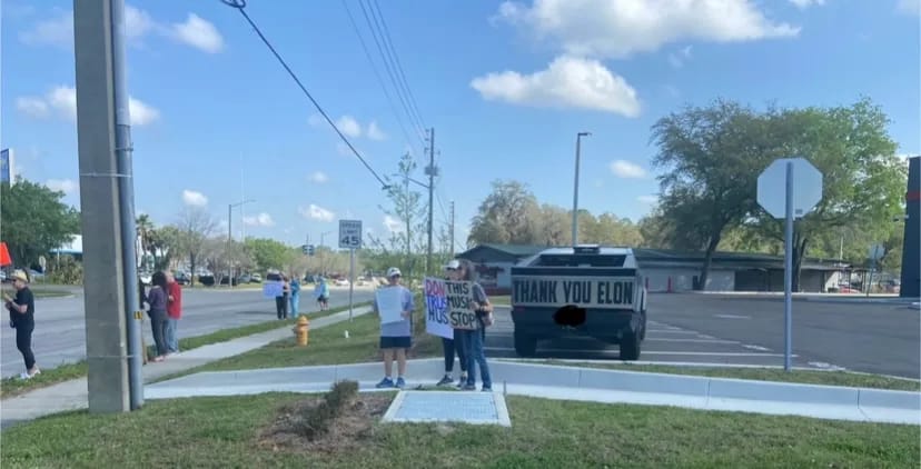 Oh, and we also found a nice combo of some Tesla protestors and Drake's Cybertruck who is a Tesla supporter… the Cybertruck reads “Thank you Elon” while the signs are saying “This Musk stop” and “Don’t trust Musk”: