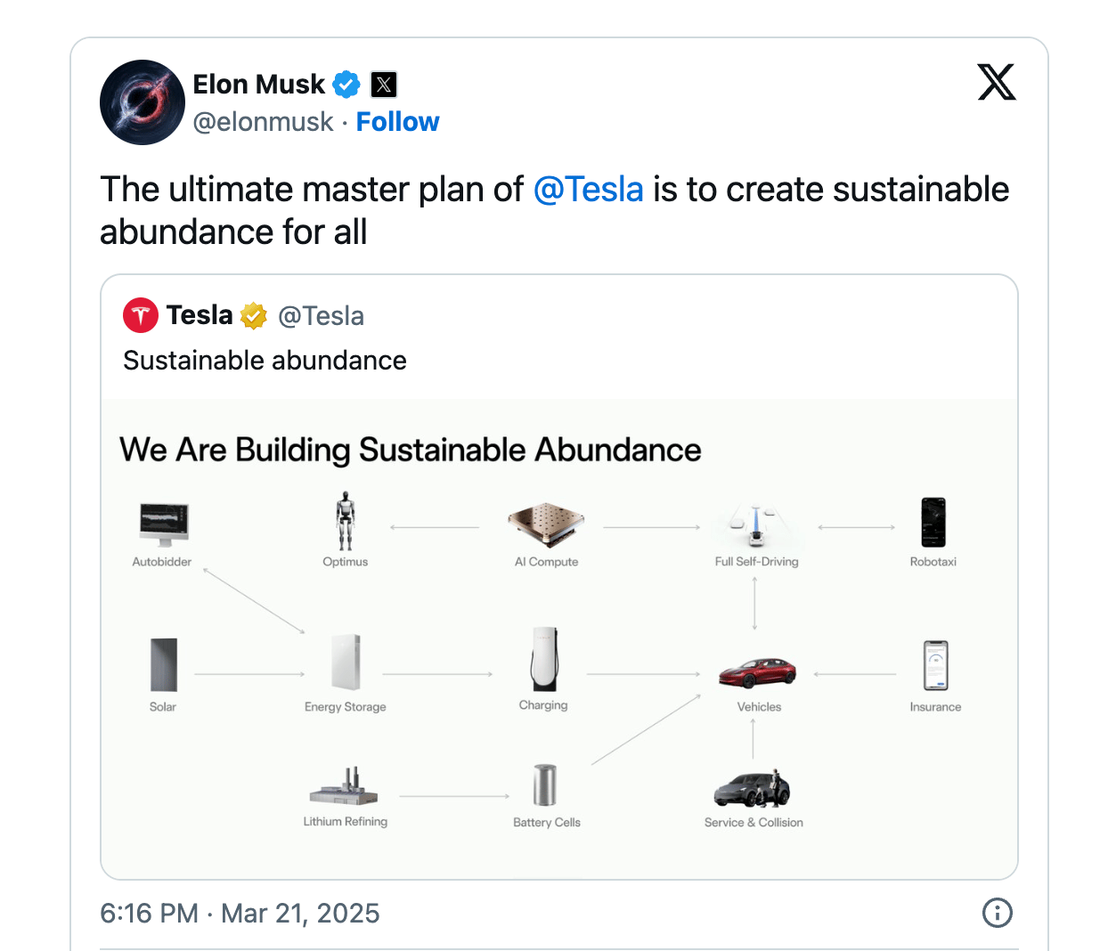 First of all – you know of Elon’s Master Plans – the 1, 2, and 3 - which Elon says we’re in right now, right? Well it seems that Elon skipped all the rest and jumped to “The ultimate master plan of Tesla - is to create Sustainable Abundance for all.”